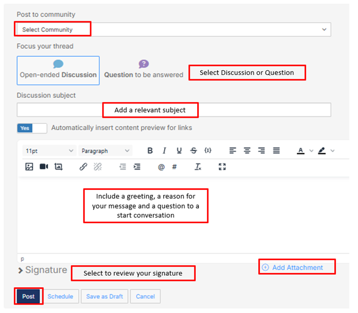 - You can upload attachments - attachments will automatically be added to the specified community library.