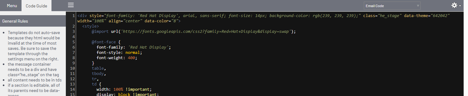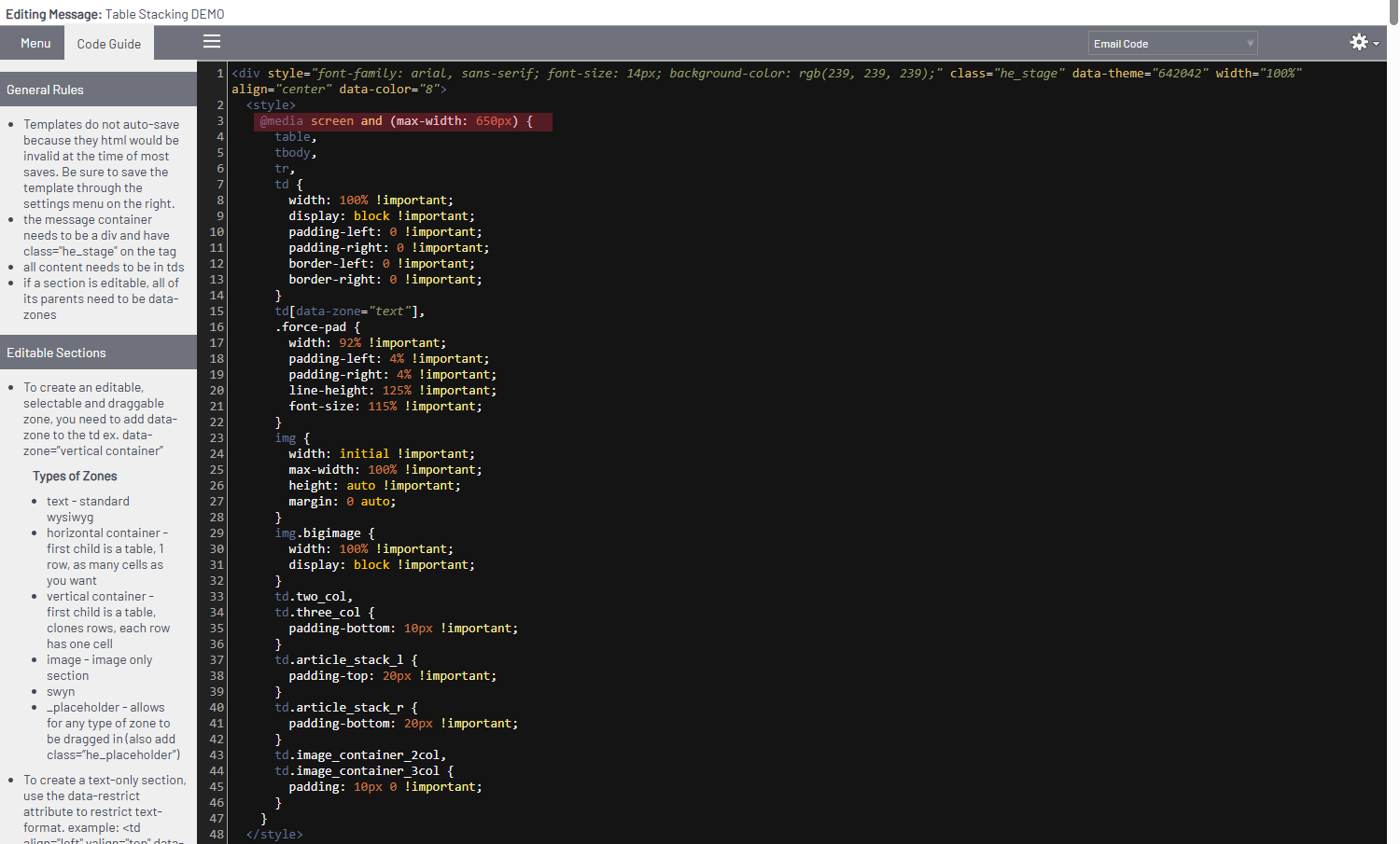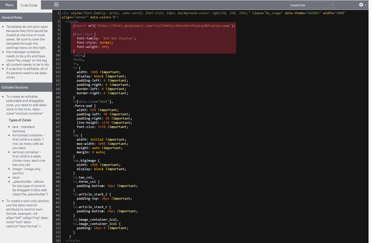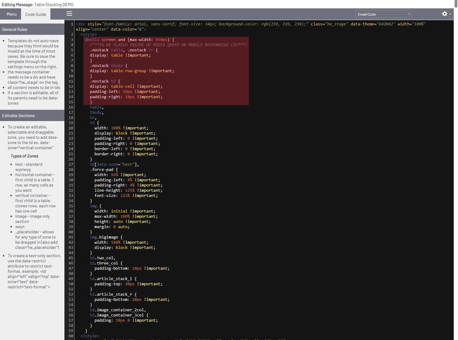 On the top of all of our Library templates, there is a standard set of responsive code that controls the mobile appearance of your message. In this area you will need to paste the snippet below after the code beginning with @media