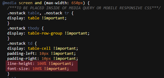 /***TO BE PLACED INSIDE OF MEDIA QUERY OR MOBILE RESPONSIVE CSS***/ .nostack table, .nostack tr { display: table !important; } .nostack tbody { display: table-row-group !important; } .nostack td { display: table-cell !important; padding-left: 10px !important; padding-right: 10px !important; }