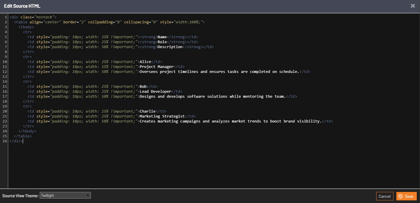 - Avoid copying in a table from an external source. Copying from a rich text format document like a Word, PDF or other document type can bring in unwanted or unexpected code that impacts the display of your message.