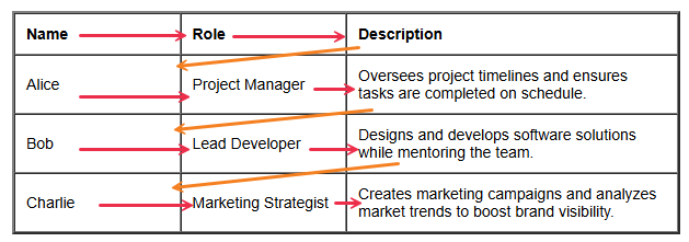 In this example table, you can see the red arrows indicate the stack order of the rows and the orange arrow indicates what would come next below the row's content.